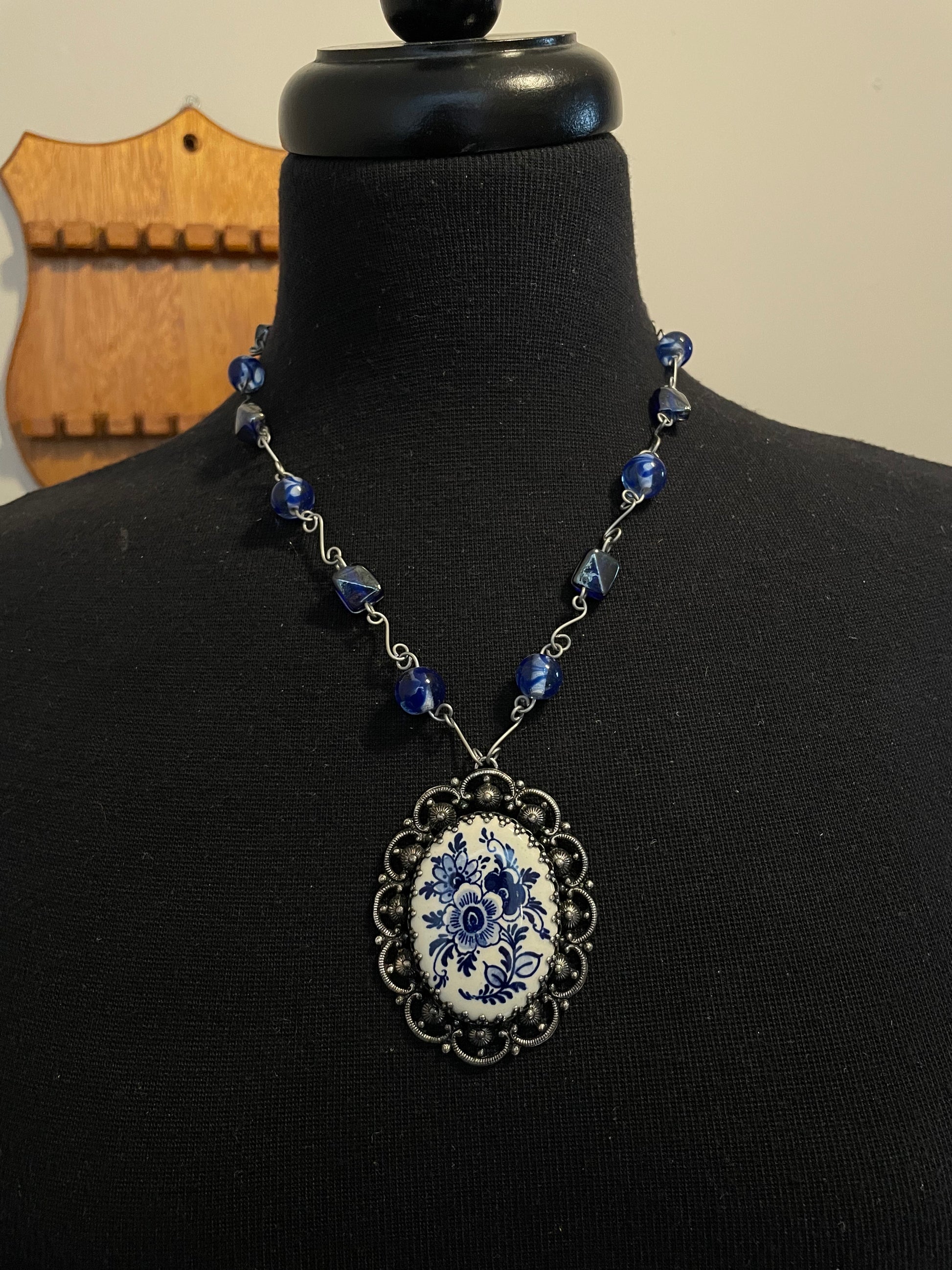 Made with stainless steel wire, blue glass beads and a vintage ceramic pendant.
