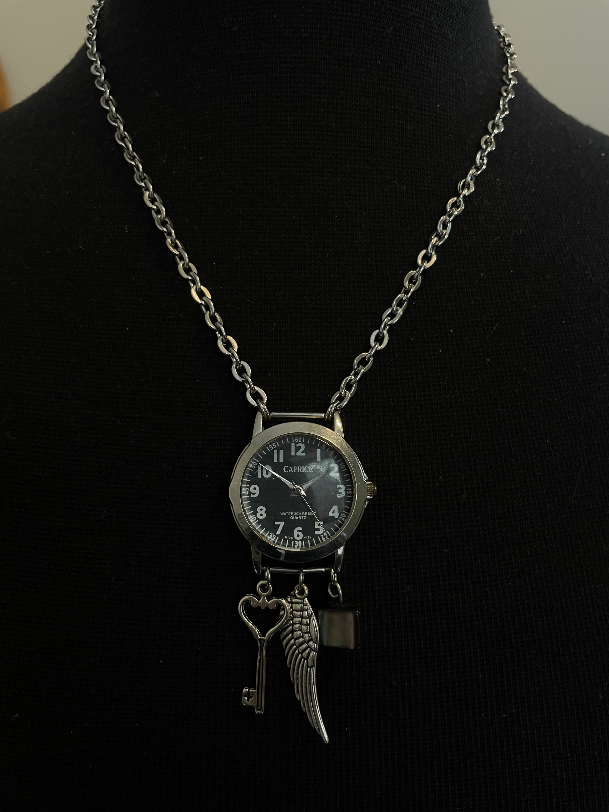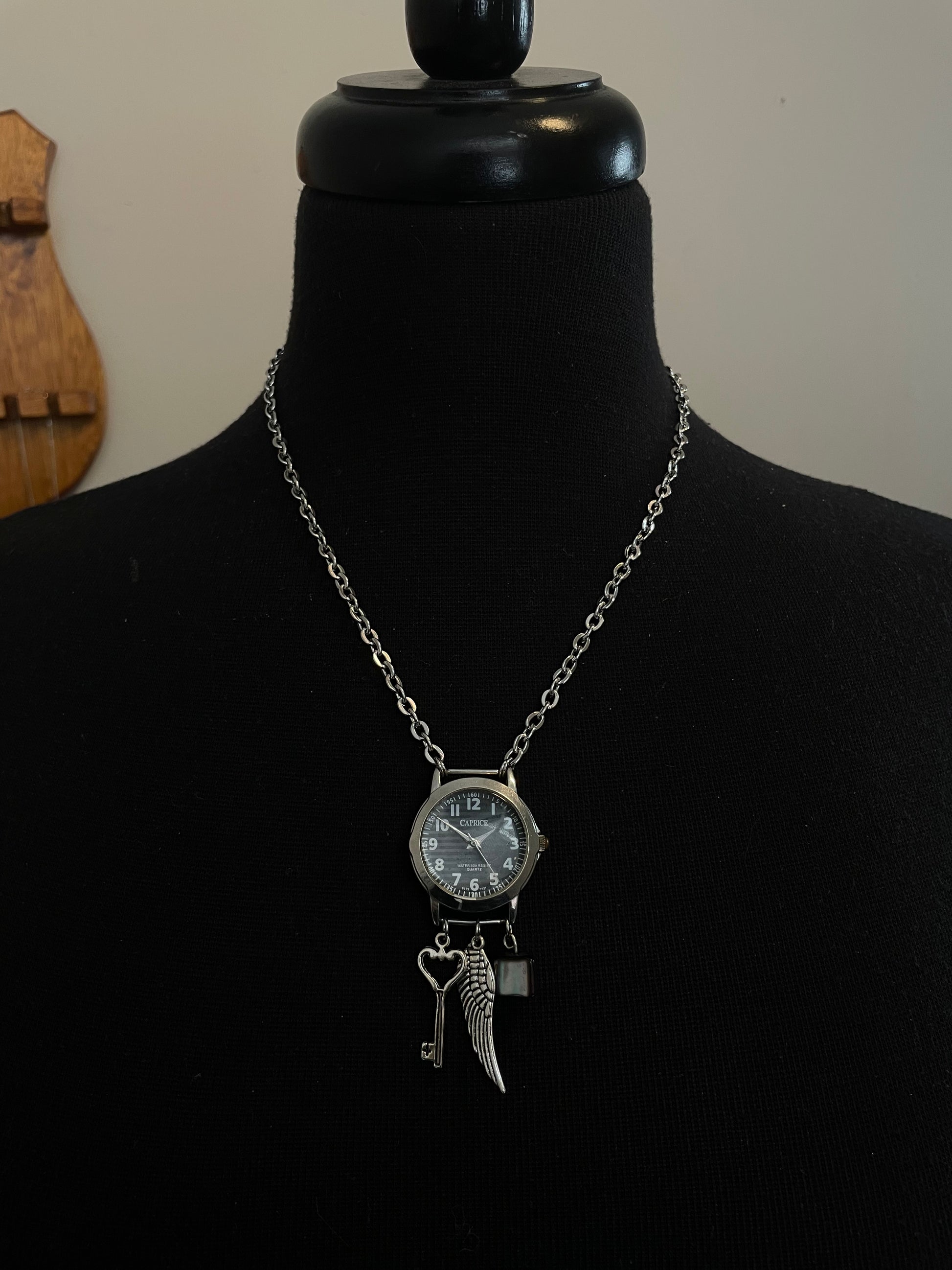 Made with a vintage watch face, charms, and a stainless steel chain.