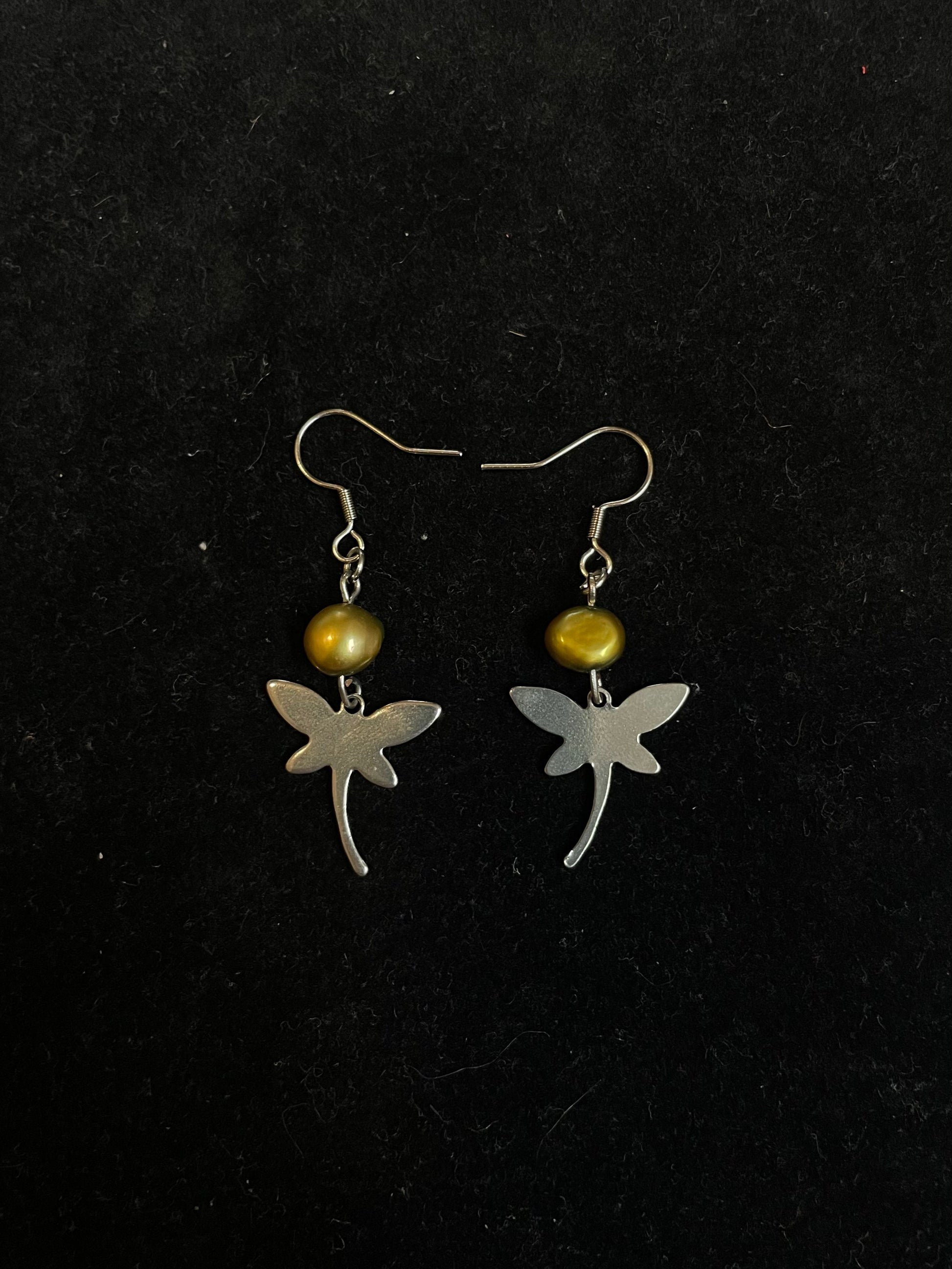 Made with stainless steel dragonfly charms, freshwater pearls and stainless steel hooks