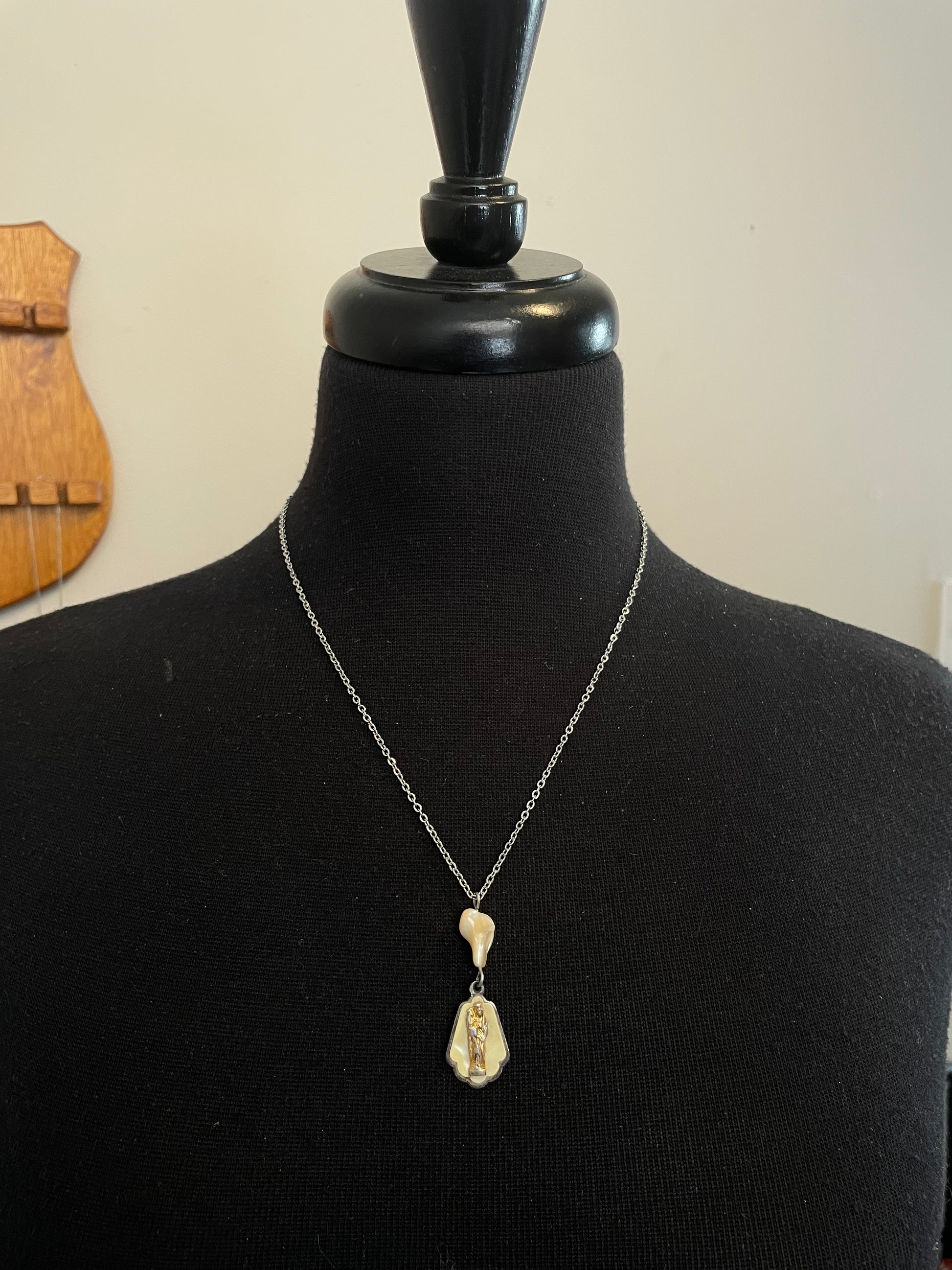 Made with a mother-of-pearl bead and a mother of pearl inlay Mary charm on a stainless steel chain.