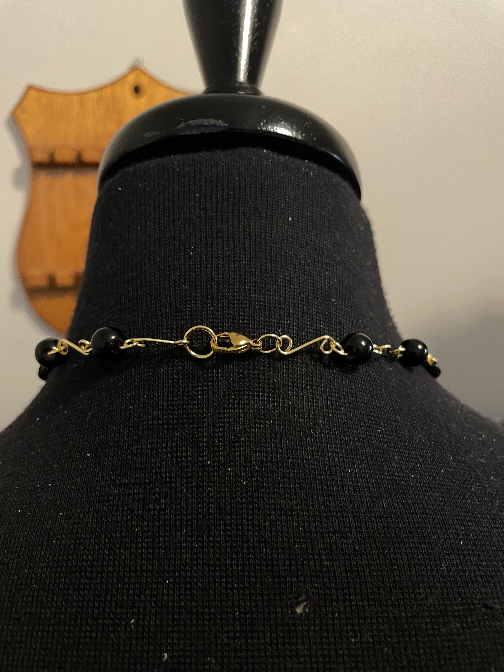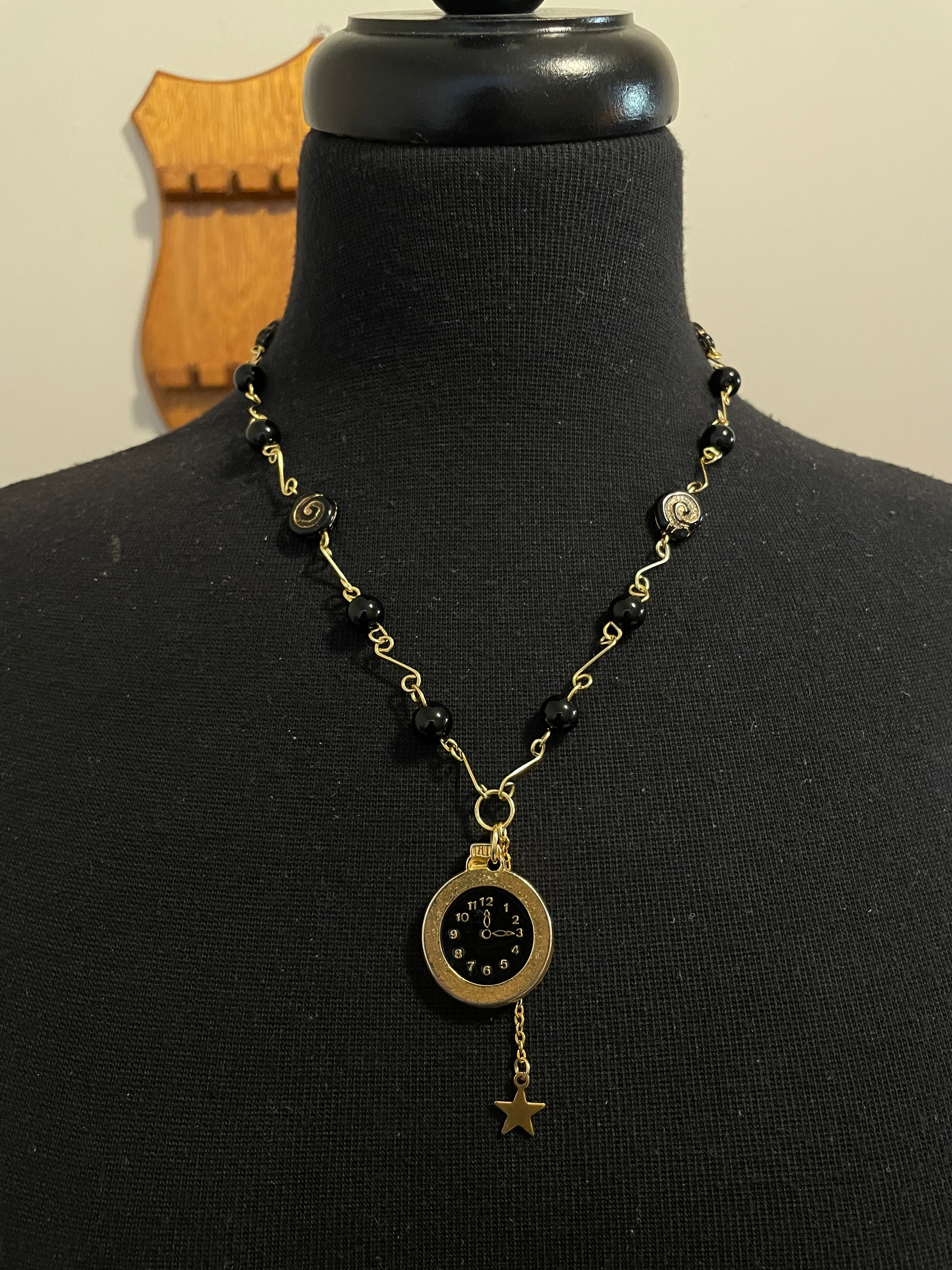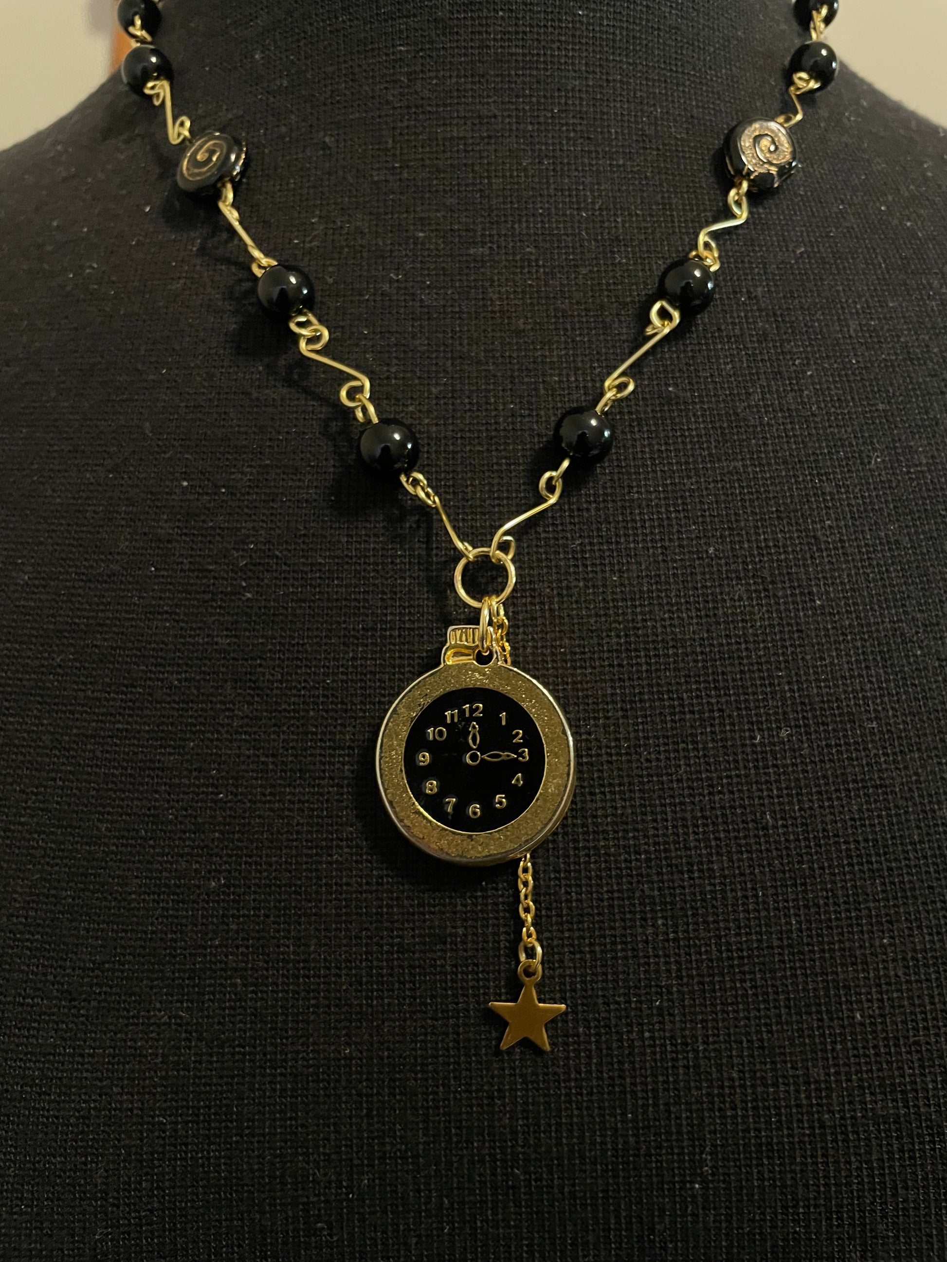 Made with gold-plated wire, glass beads and a watch pendant.