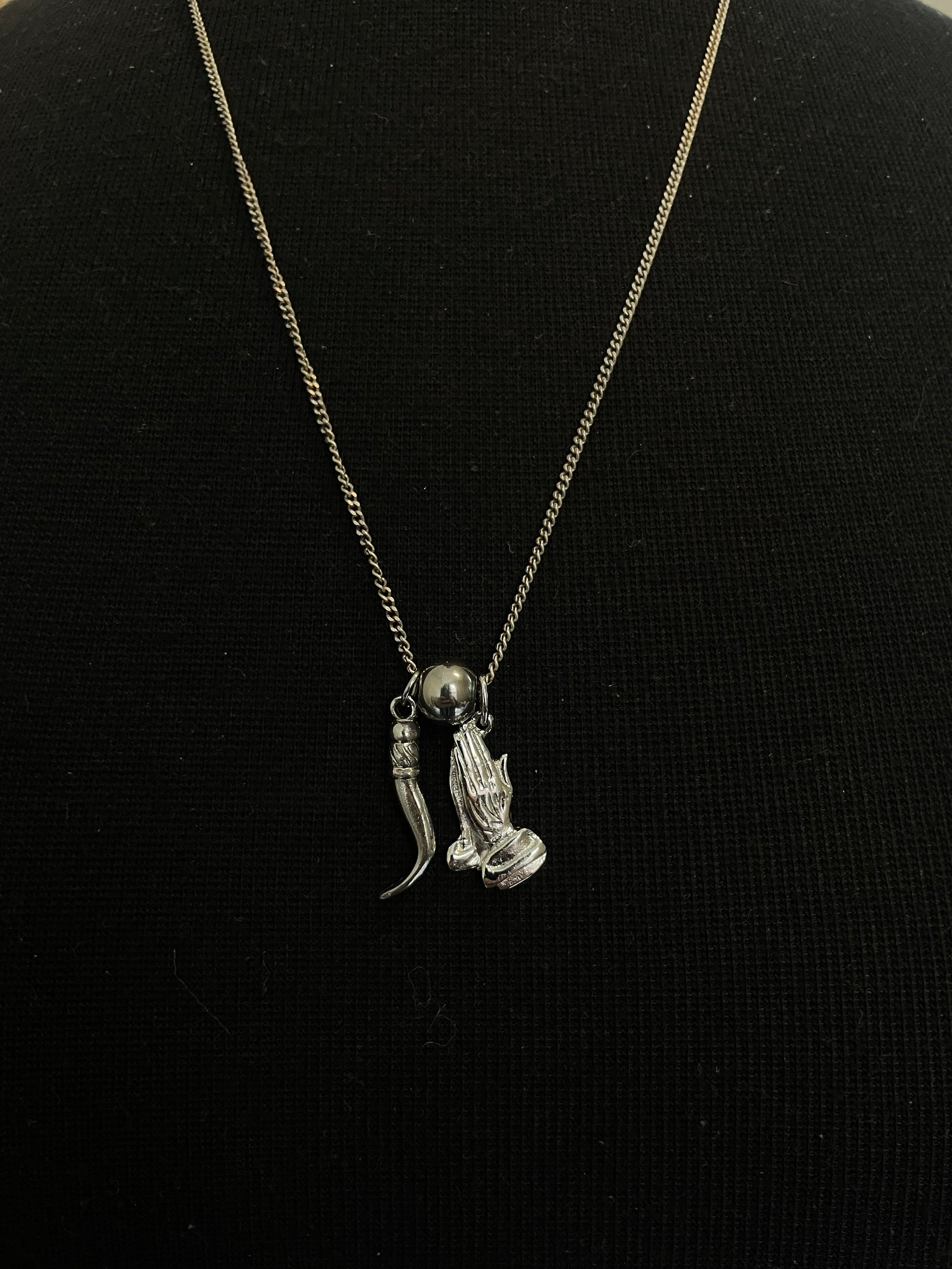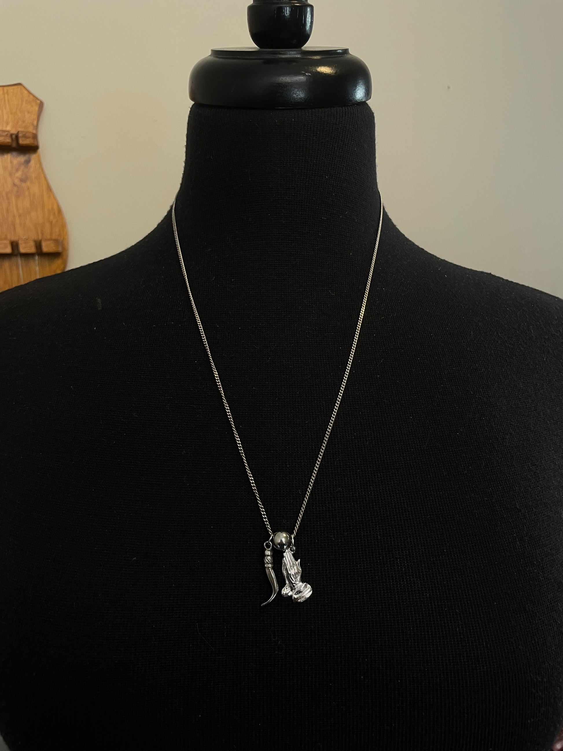 Vintage .925 sterling silver chain with a sterling silver horn, a praying hands charm, and a stainless steel bead.